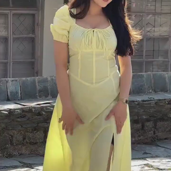 Bright, soft, and effortlessly elegant, this buttercup yellow midi dress is designed to make every day feel special. Featuring a flattering square neckline with delicate gathering and charming puff sleeves, it beautifully enhances your silhouette. The structured bodice with an adjustable lace-up back adds a trendy touch, while the flowy skirt ensures graceful movement. Crafted from lightweight, breathable cotton, it is the perfect choice for brunch dates, vacations, and summer celebrations.